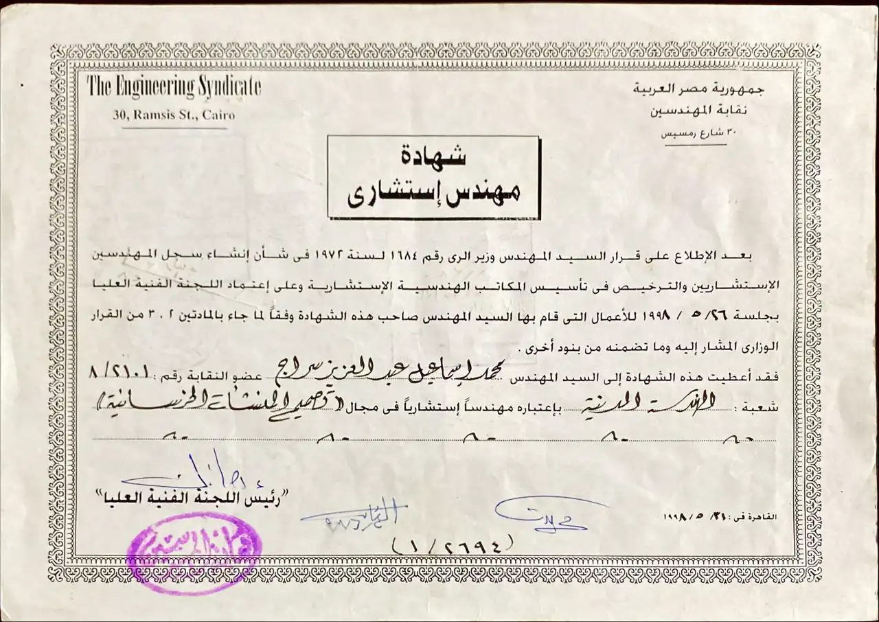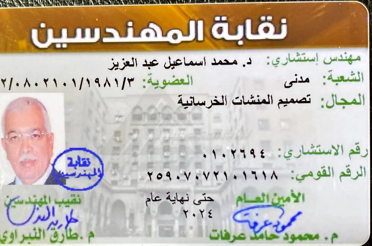 The highest professional recognition awarded to Dr. Mohamed Ismail Abdelaziz, confirming his expertise in Civil Engineering with a specialization in the Design of Concrete Structures