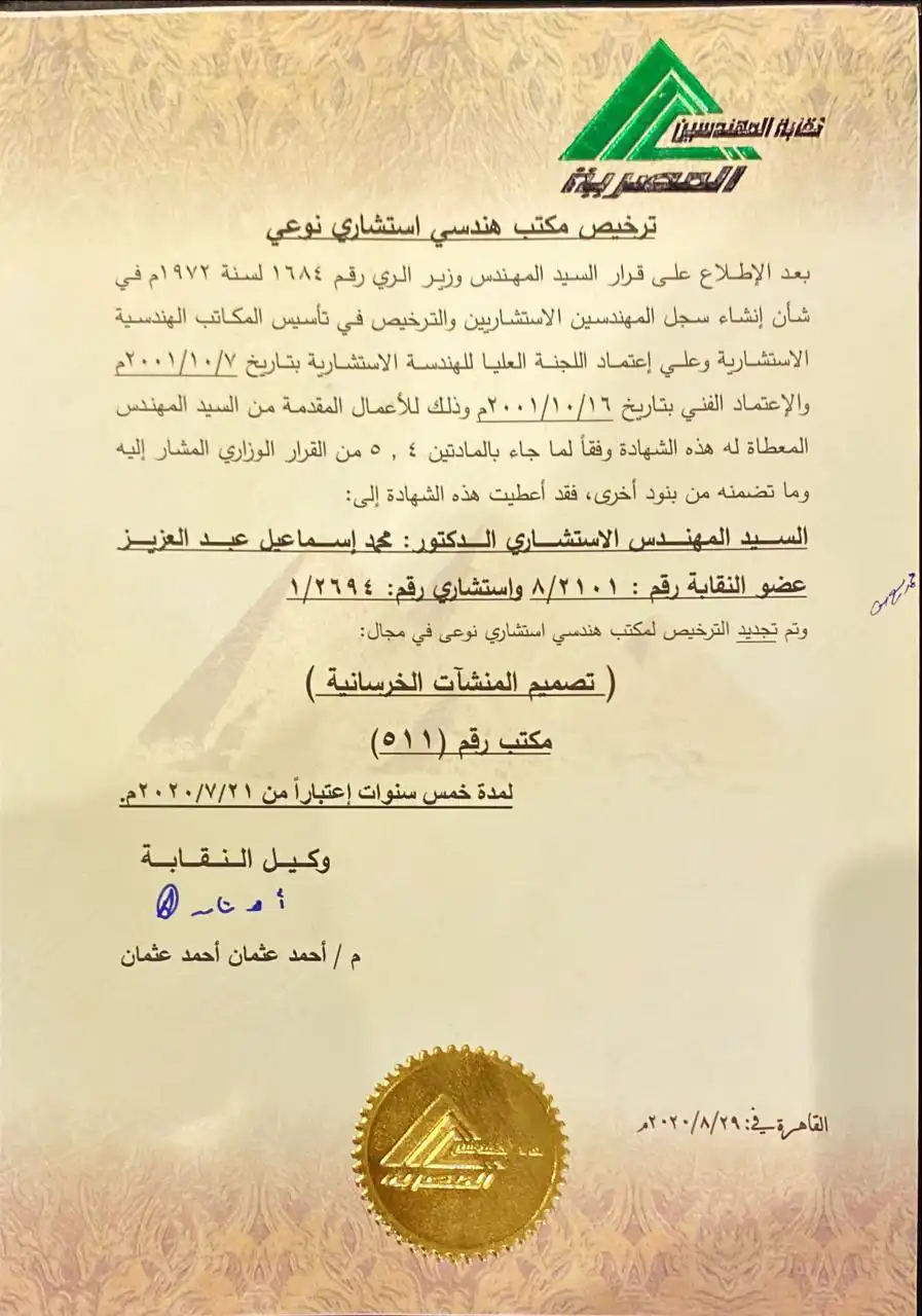 Official license (Office No. 511) for "The Egyptian House for Engineering" in the highly specialized field of Concrete Structures Design